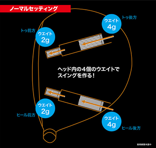 トゥ前方2g、ヒール前方2g、トゥ後方4g、ヒール後方4gのウエイト配置。一般的なヘッドに比べて重心角と重心深度が大きいが、重心距離は短い設計。芯を外したミスショットでも4個のウエイトがボールの推進力をアップする。